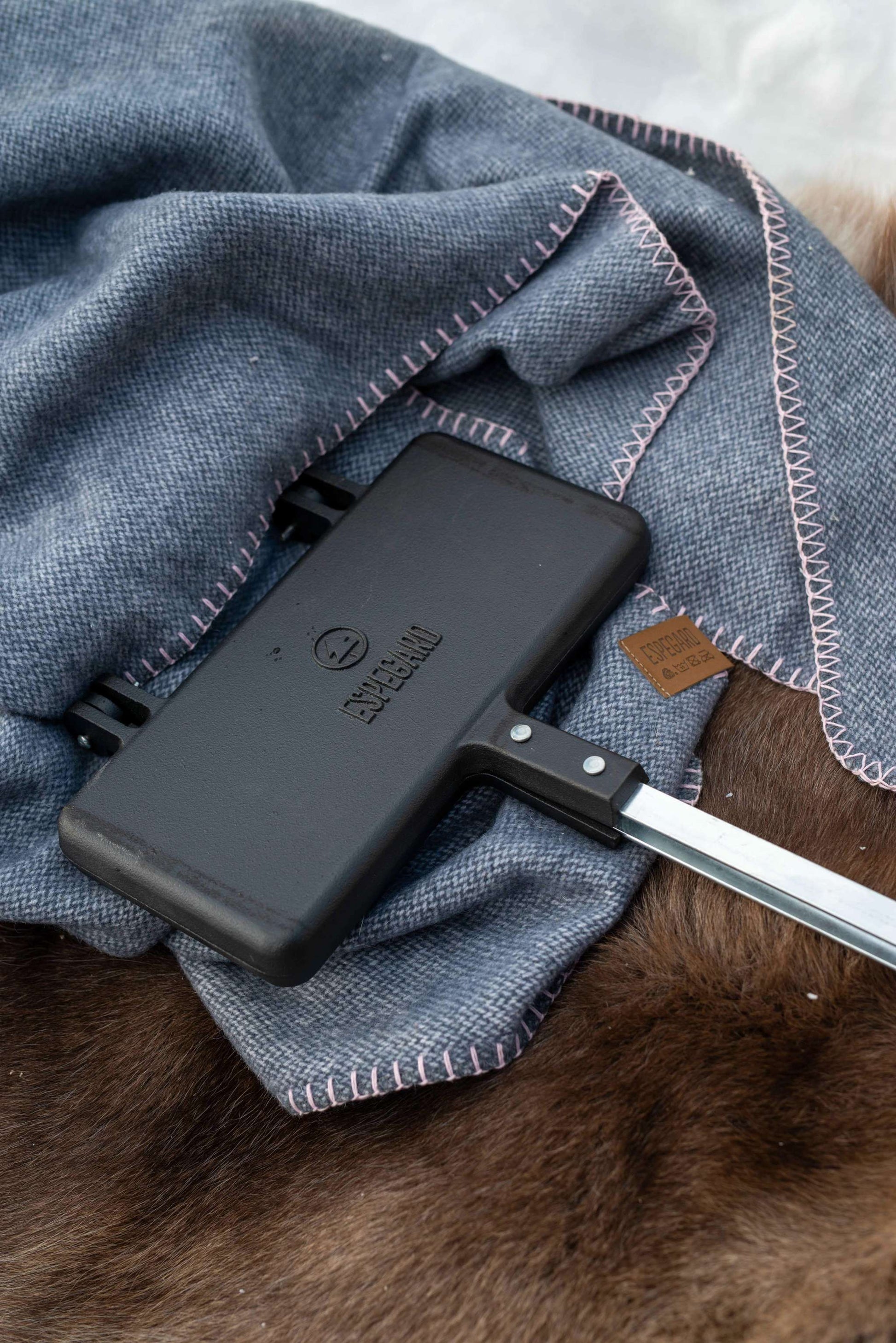 Made of cast iron with a long steel shaft and a wooden handle. Cast iron gets very hot and retains heat for a long time. Use butter or cooking oil when cooking. Apply a thin layer of cooking oil after use and store it in a dry place. Comes with its own case. Weight: 3.1kg.